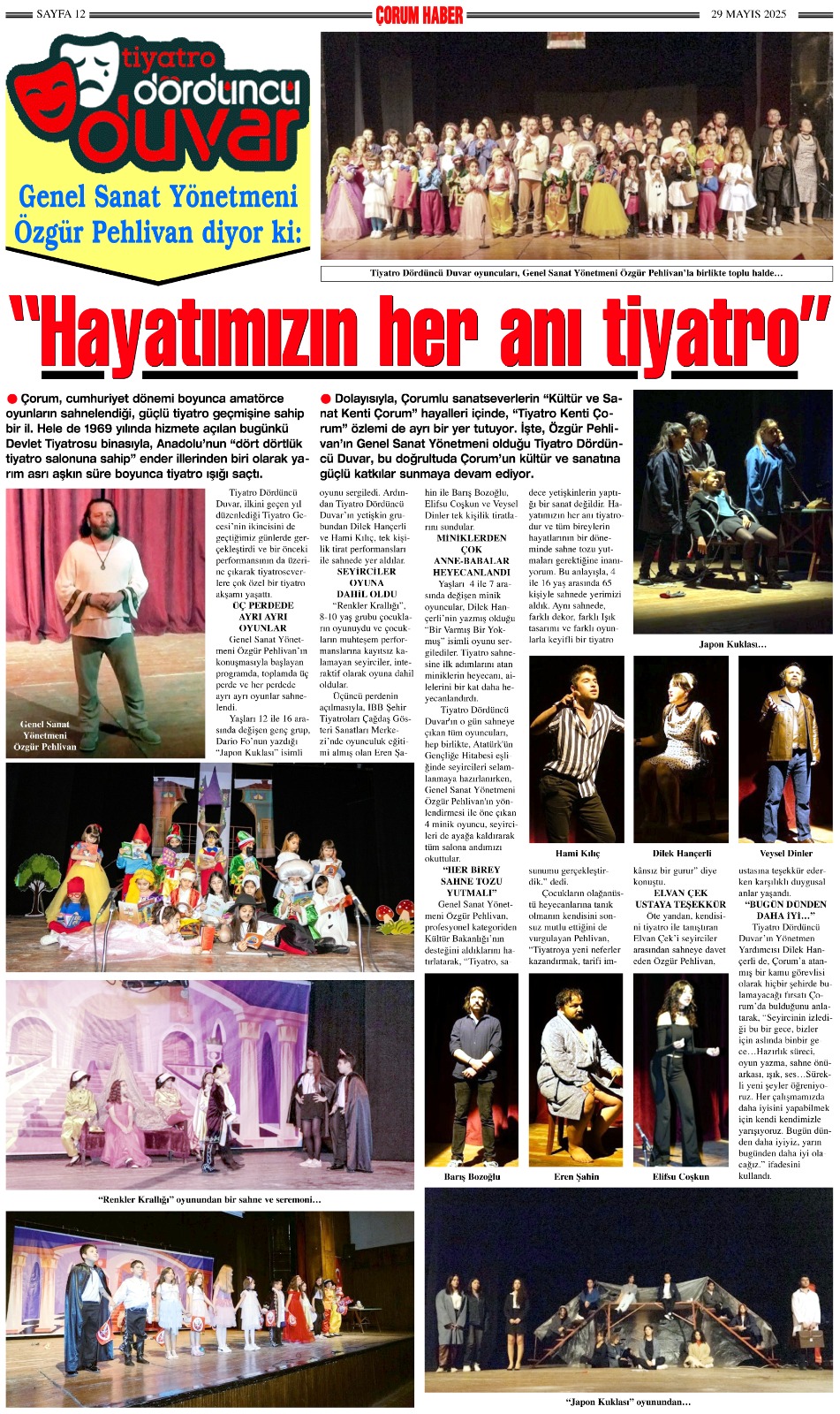 Çorum’un köklü tiyatro geleneğini yaşatmaktan gurur duyduklarını belirten Özgür Pehlivan, “Hayatımızın her anı tiyatro” diyerek tiyatronun kentin kültüründe taşıdığı özel yere vurgu yaptı. Pehlivan, Çorum’un “Kültür ve Sanat Kenti” olma hedefinin gerçek bir toplumsal talep olduğuna dikkat çekti.